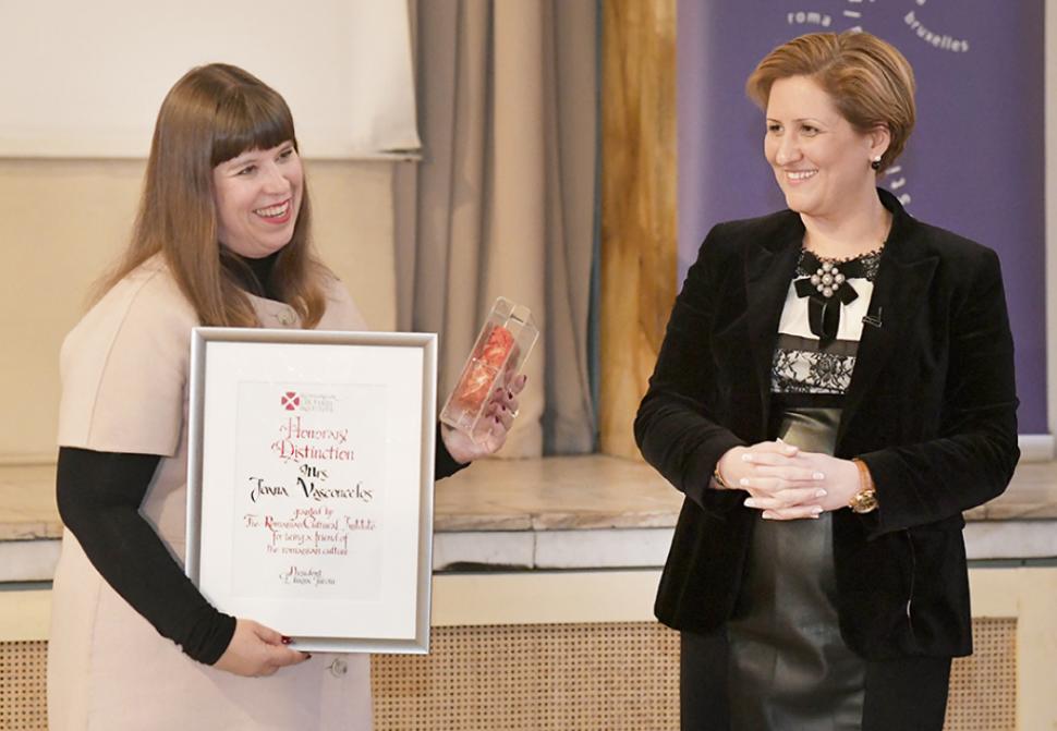 'Suntem foarte onoraţi şi bucuroşi că doamna Vasconcelos, care are expoziţii în marile muzee ale lumii, se află în aceste zile în România. Joana nu este numai un om extraordinar, ci şi un reprezentat de seamă al industriilor creative. Ea a devenit o industrie, un model pentru cei tineri', a spus doamna Liliana Ţuroiu. În numele Institutului Cultural Român, preşedintele ICR i-a acordat Joanei Vasconcelos o distincţie de 'prieten al culturii române'.