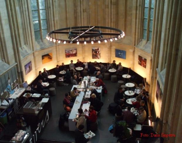 Unul dintre cele mai interesante elemente ale design-ului interior al librăriei din Maastricht se află în locul fostului cor, transformat în cafenea. Este vorba despre o masă impresionantă în formă de cruce care este iluminată de un candelabru suspendat.