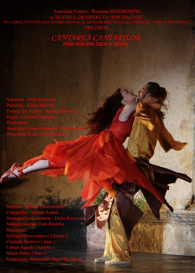 ?Cântarea Cântărilor? este un spectacol adaptat după celebrul pasaj Biblic. Această montare modernă scoate în evidenţă caracterul paradoxal al textului: lupta dintre material şi imaterial, dintre trup şi spirit, dintre atracţia sublimului şi terestru. Mesajul de iubire este omniprezent: iubirea dintre doi oameni, ca şi cea dintre Dumnezeu şi poporul Sau, o dragoste care trece prin toate formele (extatică, fizică, erotică, dar şi transcendentă, spirituală şi metaforică).