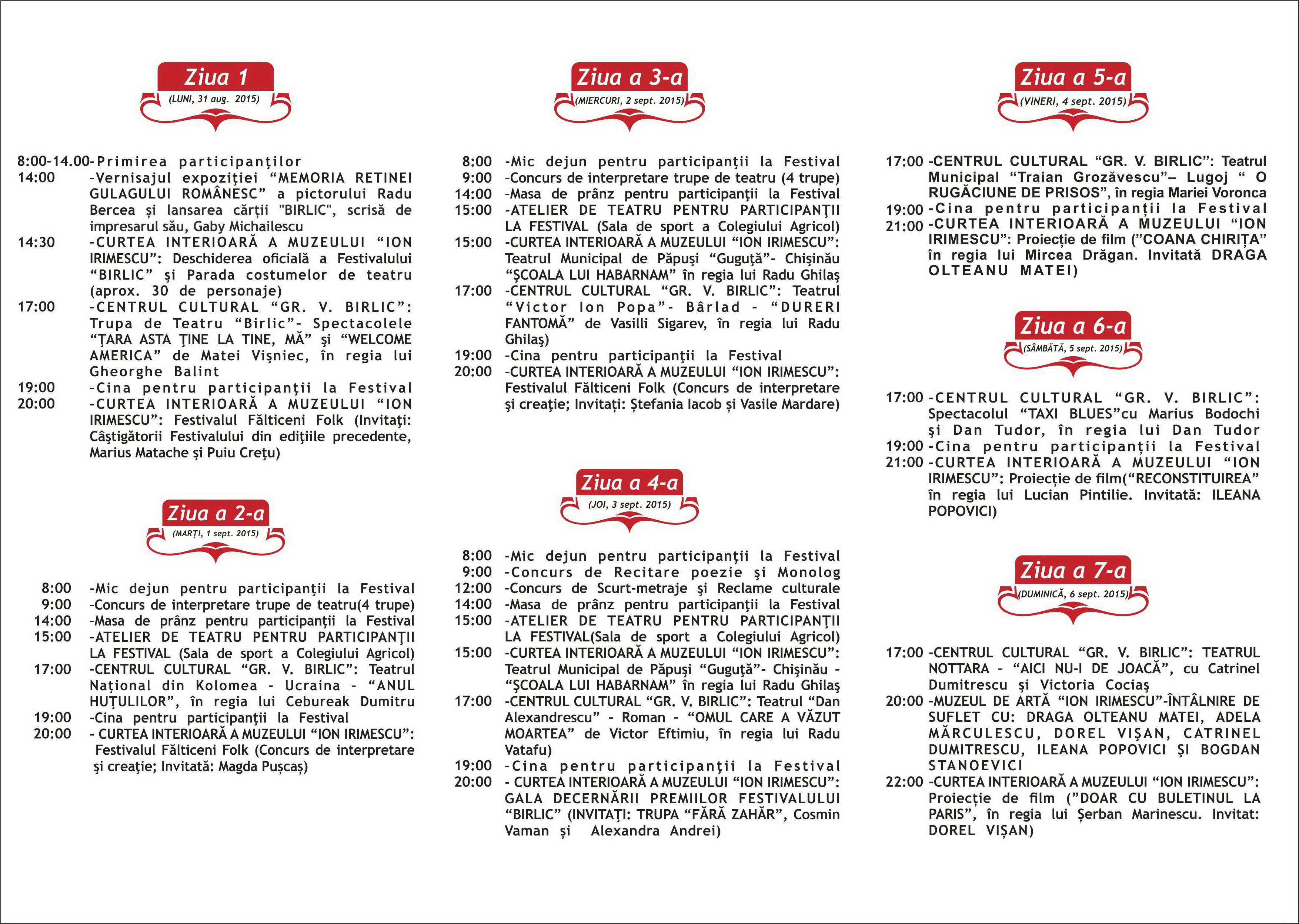 În premieră, anul acesta, teatrul şi folkul se reunesc la Fălticeni, dat fiind că ediția a IV-a a festivalului Fălticeni Folk 2015 se desfăşoară în cadrul Festivalului „Birlic”.