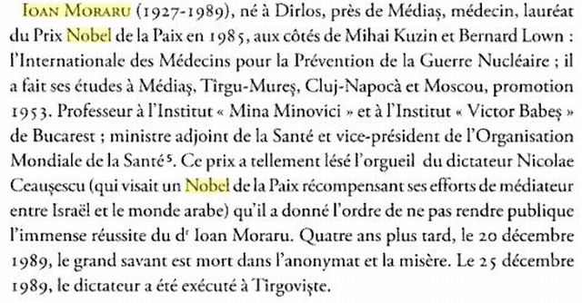 În acel an Premiul Nobel pentru pace a fost decernat organizaţiei International Physicians for the Prevention of Nuclear War (în traducere Medicii lumii pentru prevenirea razboiului nuclear). Trei persoane erau liderii acestei organizaţii mondiale: un rus, un american şi un român! Nu un român emigrant, care fugise din România, ci un român care trăia în România condusă de Nicolae Ceauşescu. Numele său este Ioan Moraru (foto) şi este un ilustru necunoscut printre compatrioţi. După ce a primit celebra distincţie, a intrat rapid într-un con de umbră, regimul de atunci neputând trece cu vederea că "i-a furat premiul lui Ceauşescu."