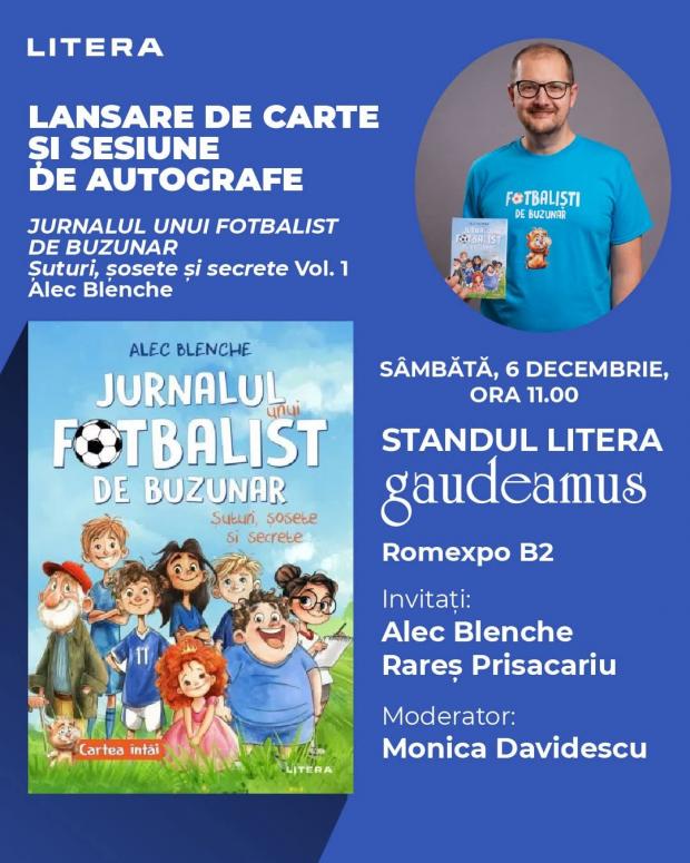 „Jurnalul unui fotbalist de buzunar. Șuturi, șosete și secrete” se lansează, pentru a doua oară, sâmbătă, 6 decembrie, la Târgul Gaudeamus din București, începând cu ora 11:00. La eveniment vor participa „căpitanul” echipei, autorul Alec Blenche, iar discuția va fi „arbitrată” de Monica Davidescu.