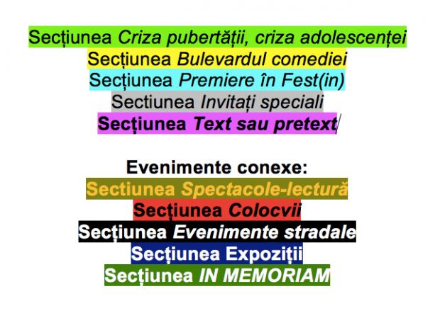 „Criza pubertăţii, criza adolescenţei" este o secţiune competitivă, în cadrul căreia vor fi supuse atenţiei spectatorilor producţii pentru şi despre tineri. Secţiunea "Text au pretext" va cuprinde spectacole prin intermediul cărora publicului va cunoaşte importanţa echipei de creatori şi de artişti în realizarea unei producţii scenice. Vor fi prezentate câte două variante de spectacol pe acelaşi text.
