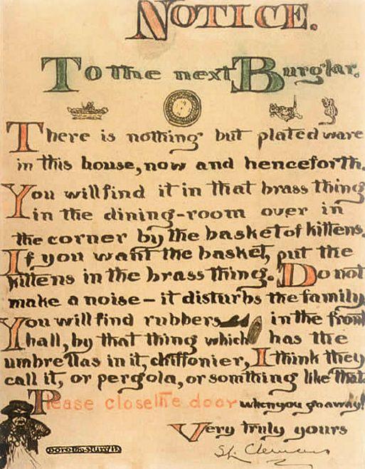 La o zi după incident, cu ajutorul unui tânăr artist, Twain a realizat următorul afiş dedicat viitorilor posibili hoţi. Începând din acea zi, biletul a stat în permanenţă agăţat de uşa scriitorului.