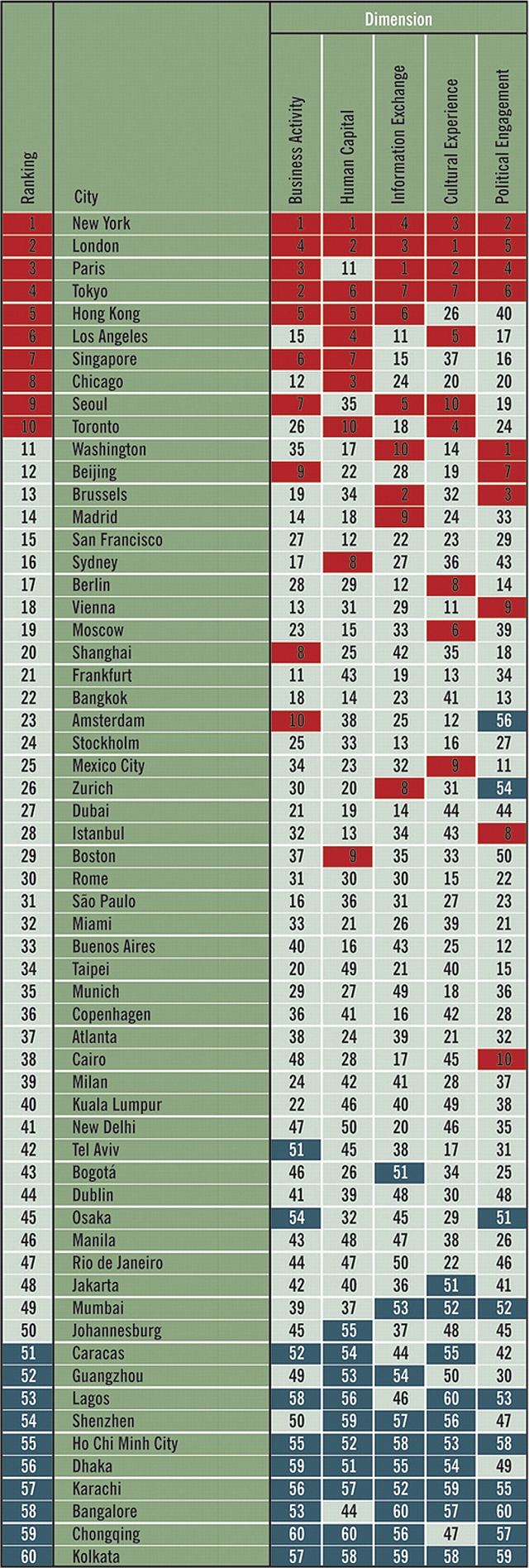 Principalele criterii folosite în realizarea clasamentului au fost activitatea mediului de afaceri, capitalul uman, schimbul de informaţie, experinţa cultutrală şi angajamentul politic.