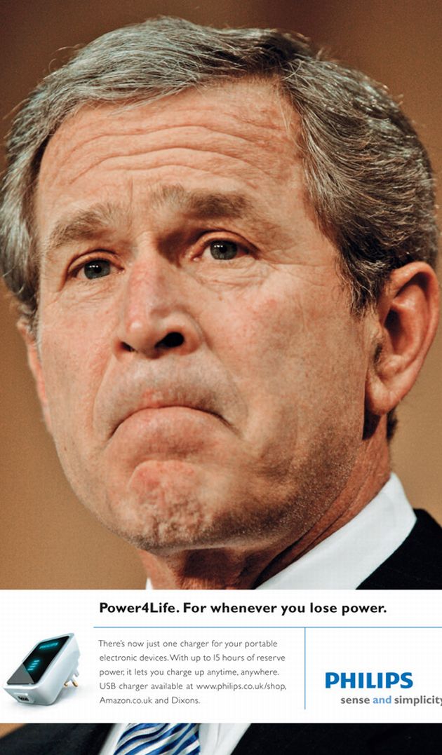 Campania a fost gândită pentru a coincide cu învestirea lui Obama în funcţia de preşedinte al Statelor Unite, şi a fost difuzată astăzi în mai multe cotidiene din marea Britanie. Reclama Philips a fost creată de agenţia londoneză DDB şi prezintă o fotografie a lui Bush care arată ca şi cum a pierdut cea mai puternică slujbă din lume.