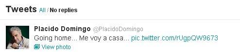 "Going home..." (plec acasă - n.r), a scris Placido Domingo, pe reţeaua de socializare. Anunţul este însoţit de două fotografii ale sale, surprins când intra în maşina rudelor sale.
