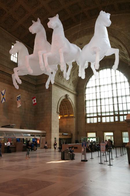 Expozitia de artă contemporană intitulată „Lumi plutitoare” propune o întâlnire cu 5 lucrări inedite, Floating Forest, End Game, Quadriga II, Sleeping Giants, Alto-Cumulus, instalaţii gonflabile cu diferite forme, ce par a fi insufletite graţie unor ventilatoare industriale şi mecanisme simple cu supape.