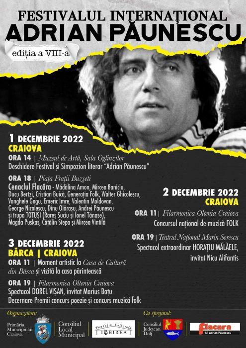 - A doua zi, pe 2 Decembrie, de la ora 11, va avea loc o nouă ediţie a Concursului de Muzică Folk. Seara, de la ora 19, la Teatrul Național Marin Sorescu, Horațiu Mălăele, îl va avea invitat pe Nicu Alifantis.