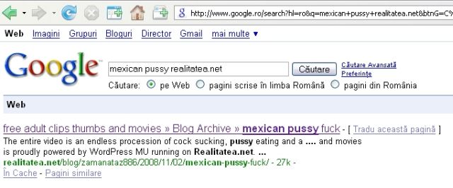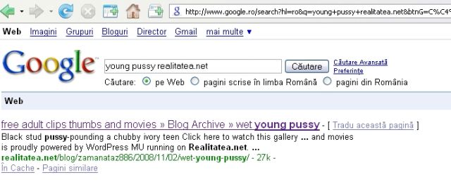 "Erorile" au fost semnalate de internauţi, precum Lucian Mogoşanu şi Alexandru Rahoveanu. De când practicile au fost date în vileag, realitatea.net a remediat problema, astfel de cuvinte nemaiapărând pe site. Totuşi, Google rămâne fidelul... deconspirator. Aşa că, dacă vreţi să căutaţi mexican pussy sau young pussy pe realitatea.net aveţi rezultate din belşug. Numai că, acum o să fiţi redirecţionaţi către o pagină "cinstită" de blog.