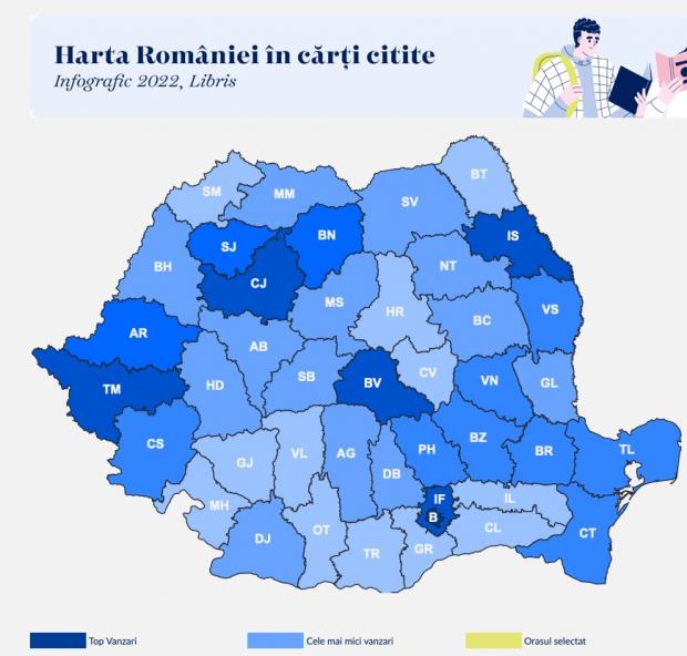 Cele mai multe comenzi de carte pe cap de locuitor s-au făcut în 2022 din București, urmat de Brașov și Cluj, iar cele mai puține comenzi pe Libris s-au plasat din Harghita, Covasna și Ialomița.