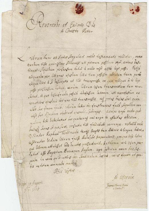 În momentul descoperirii sale, între paginile cărţii se afla şi o scrisoare datată „Praga 19 august 1666”, scrisă de un anume Joannes Marcus Marci şi adresată lui Athanasius Kircher, ilustru gânditor și lingvist al vremii, unul dintre primii cercetători care încercase, printre altele, descifrarea hieroglifelor egiptene.