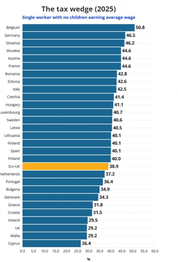 Potrivit raportului din 2026 al Tax Foundation, „wedge-ul fiscal” variază de la 26,4% în Cipru la 50,8% în Belgia, în 28 de țări europene — statele membre ale UE și Regatul Unit. Datele se referă la nivelurile de taxare din 2025 pentru un angajat singur, fără copii, cu salariu mediu național. Procentele diferă în funcție de situația familială și nivelul veniturilor.