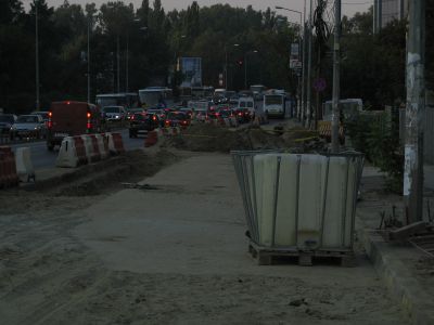 Ora 19.00 - Lucrările din zona intersecţiei de la podul Băneasa au fost abandonate, gropile în care săpau mai devreme muncitorii fiind acum înconjurate de o bandă galbenă.