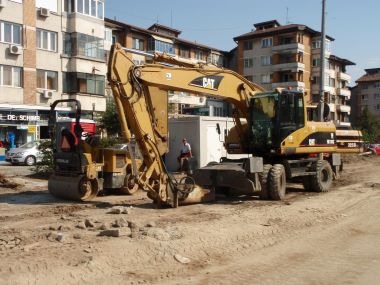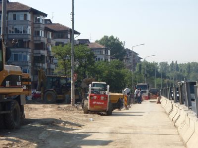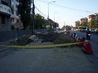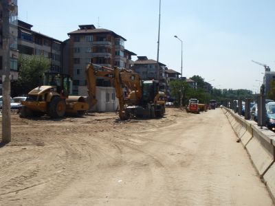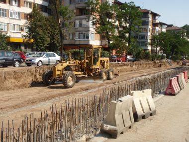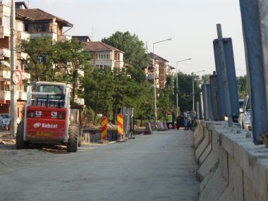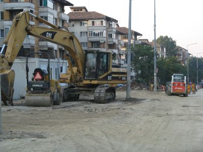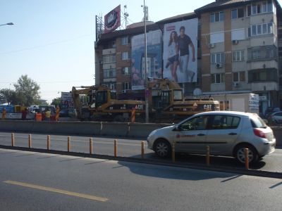 Vizavi de sediul Antenei 1 lucrările stagnează. Excavatoarele şi basculantele aşteaptă liniştite muncitorii care parcă au intrat în pământ. Doar unul dintre ei, probabil rămas pentru a avea grijă de utilaje stă la umbra unei barăci.