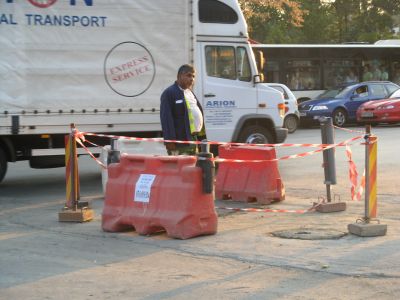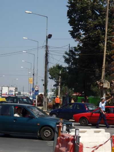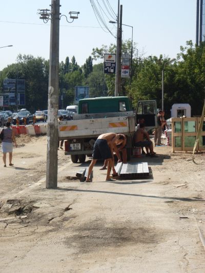 Ora 8.00- Traficul e greu, deşi e joi, e vară şi lumea este în concediu. Coada de maşini se întinde până la gara Băneasa, în sensul de mers spre aeroport. Muncitorii au ajuns, punctuali, la lucru. Nu s-au apucat de muncă toţi, dar măcar au pus mâna pe instrumente.