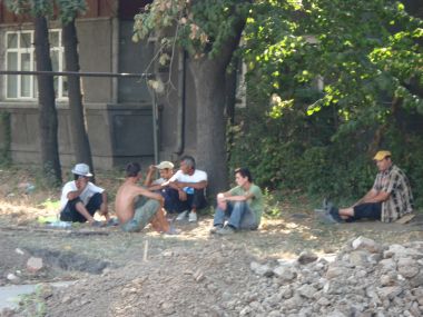 Ora 17.00 - Un grup de muncitori aşteaptă cuminţi la umbra copacilor.