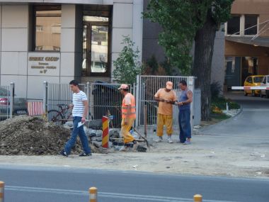 Ora 9.00- După o muncă susţinută, de aproximativ o oră, este cazul să se ia o mică pauză. Drept pentru care, din cei şase muncitori care lucrau, numai doi mai muncesc. Ceilalţi îi supraveghează, că aşa merge treaba la români.