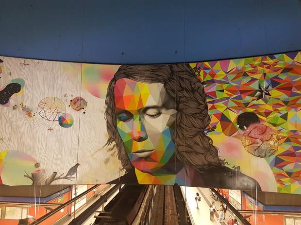 Stația de metrou Paco de Lucia. O stație ce poartă numele unui celebru chitarist de flamengo. Cea mai recentă construită în Madrid, acum patru ani. Imediat, după ce intri, un perete uriaș cu o operă artistică superbă. 20 de milioane de euro.