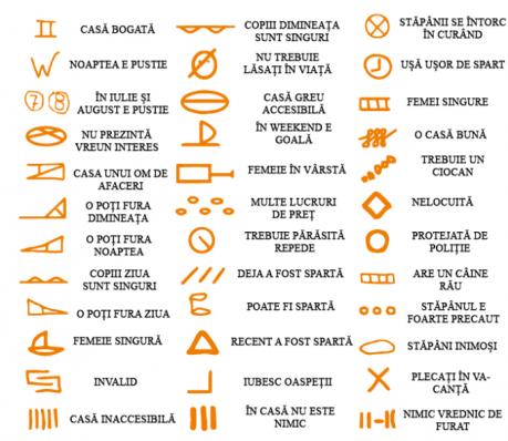 Astfel, în funcţie de cât de ușor putea fi spartă o casă, ei desenau unul din cele peste 35 de simboluri pe care le prezentăm mai jos. Fiecare simbol are sensul lui. Dacă găsești vreun astfel de simbol, înseamnă că locuința ta a intrat în vizorul bandiților și trebuie neapărat să suni la poliție.