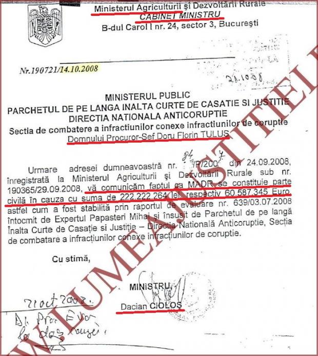 Prin adresa nr. 190721/14.10.2008, semnată de ministrul Agriculturii de la acea dată Dacian Ciolos, adresă trimisă către șeful Sectiei I a DNA, procurorul Doru Florin Tulus, ministrul a scris următoarele: “Urmare a adresei dvs nr. 84/P/2007 din 24.09.2008 inregistrata la Ministerul Agriculturii si Dezvoltarii Rurale sub nr. 190365/29.09.2008, va comunicam faptul ca MADR se constituie parte civila in cauza cu suna de 222.222.264 lei, respectiv 60.587.345 euro...”