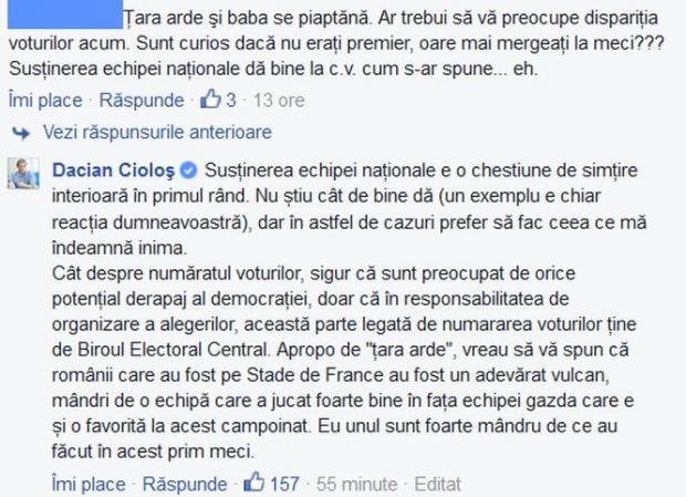 Premierul Dacian Cioloş i-a răspuns, pe Facebook, unui internaut care îi reproșa că a preferat să meargă la Euro 2016, în loc să rezolve problema voturilor lipsă.