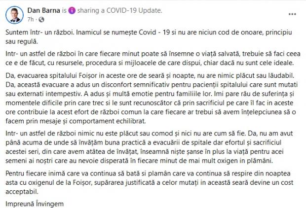 „Da, evacuarea spitalului Foișor în aceste ore de seară și noapte, nu are nimic plăcut sau lăudabil. Da, această evacuare a adus un disconfort semnificativ pentru pacienții spitalului care sunt mutați sau externați intempestiv. A adus și multă emoție pentru familiile lor. Îmi pare rău de suferința și momentele dificile prin care trec și le sunt recunoscător că prin sacrificiul pe care îl fac în aceste ore contribuie la acest efort de război comun la care fiecare ar trebui să avem înțelepciunea să o facem prin mesaje și comportament echilibrat”, a mai scris Dan Barna pe Facebook.