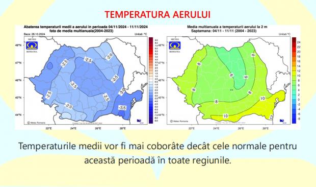 Potrivit ANM, în săptămâna 4 - 11 noiembrie, temperaturile medii vor fi mai coborâte decât cele normale pentru această perioadă în toate regiunile