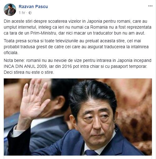 Nota bene: romanii nu au nevoie de vize pentru intrarea in Japonia incepand INCA DIN ANUL 2009, iar din 2016 pot intra chiar si cu pasaport temporar. Deci stirea nu este o stire", a scris Răzvan Pascu.