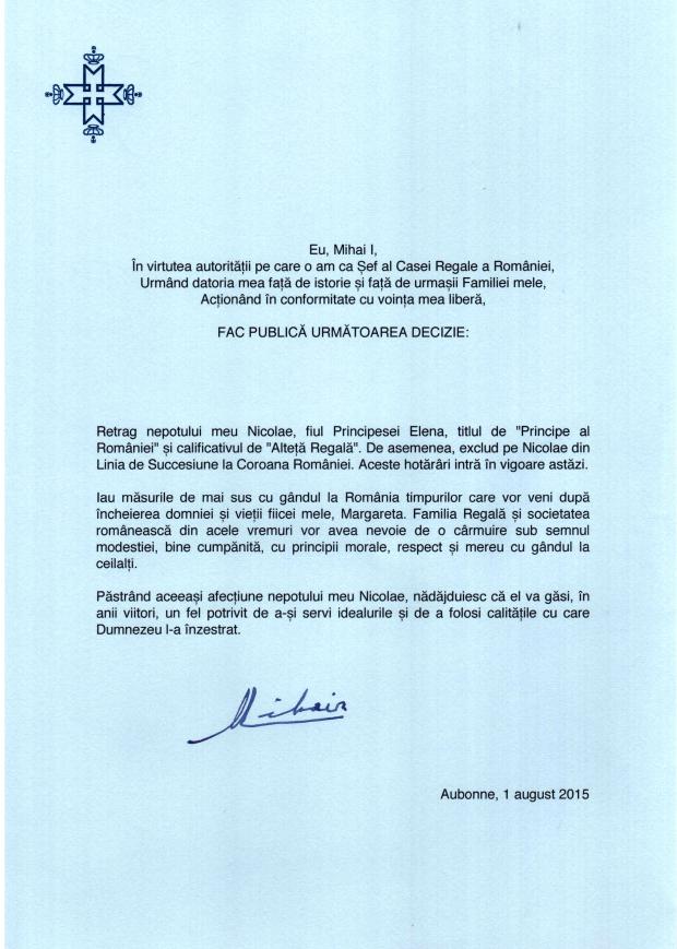 Iată Decretul Regal, publicat pe site-ul Familiei Regale: