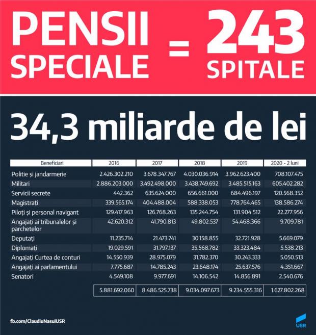 „Tot despre pensii speciale şi priorităţi. Ştiţi cât a cheltuit statul român în ultimii 4 ani cu pensii speciale? 34.3 miliarde de lei. Cu banii pe pensii speciale în doar ultimii 4 ani de zile, puteam construi în România 243 de spitale noi nouţe, la standarde înalte”, a spus deputatul.