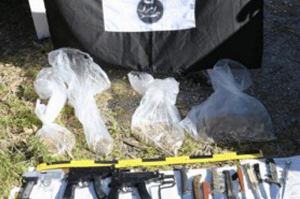 Poliţiştii au descoperit patru pistoale, o puşcă cu aer comprimat modificată pentru a trage cu muniţie adevărată, două puşti automate Scorpion, muniţie şi mai multe tipuri de cuţite.