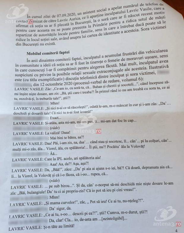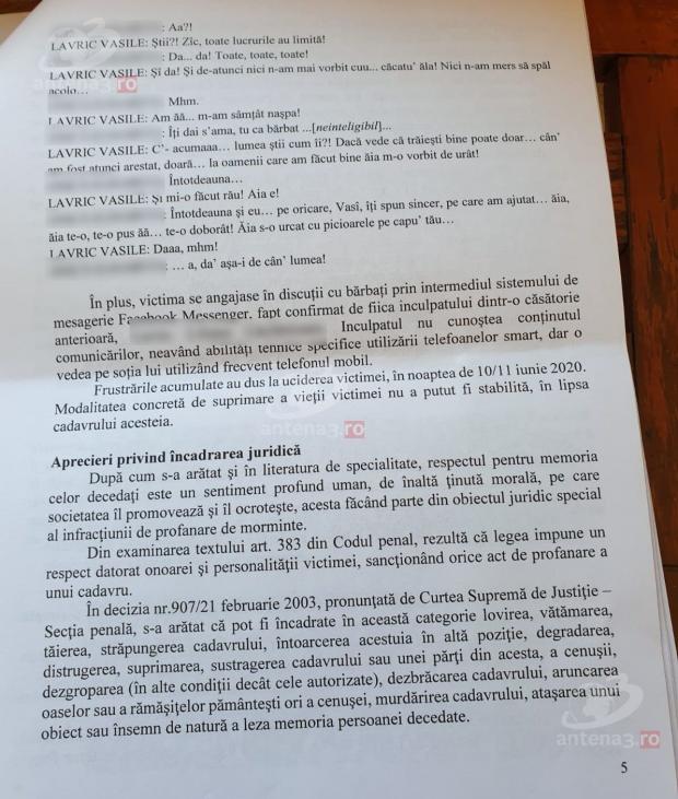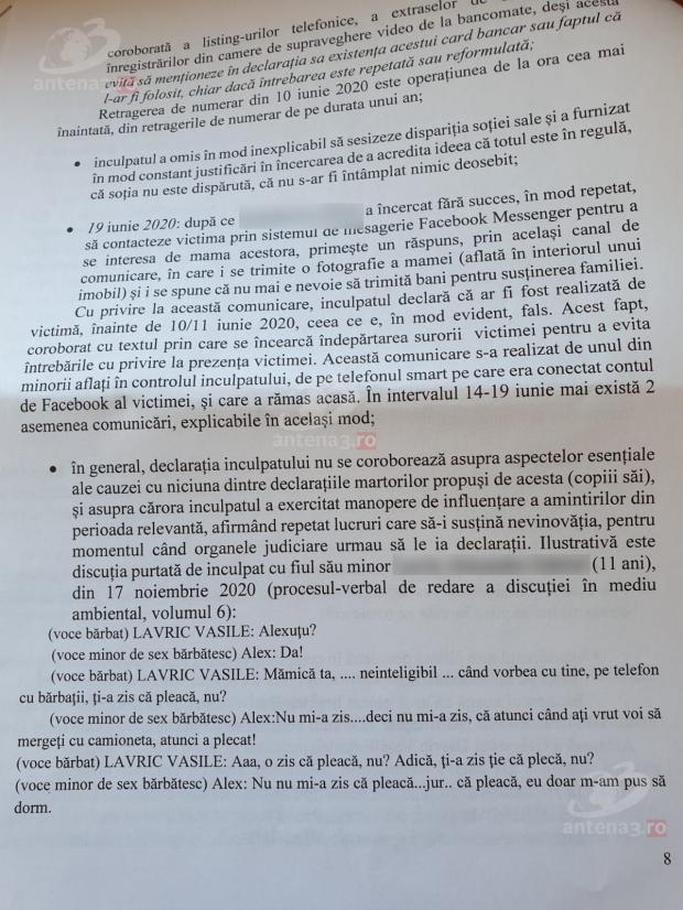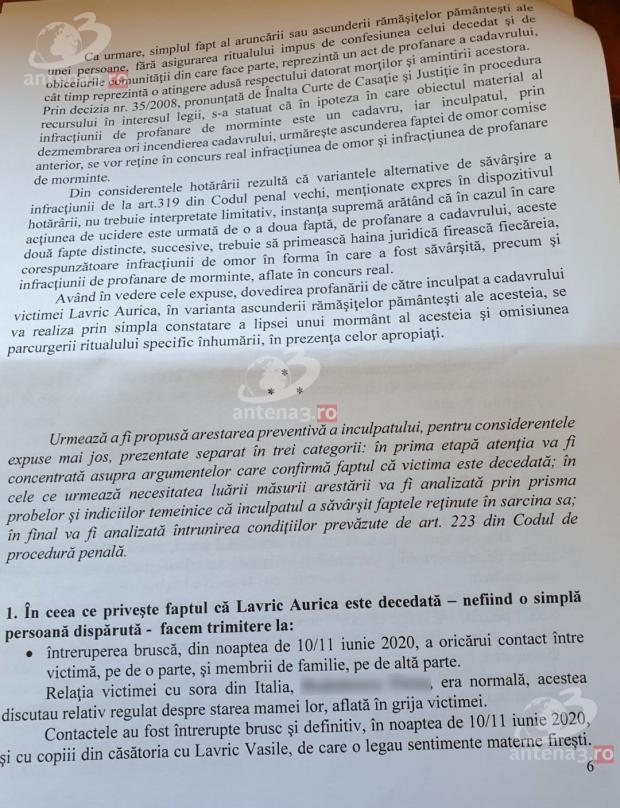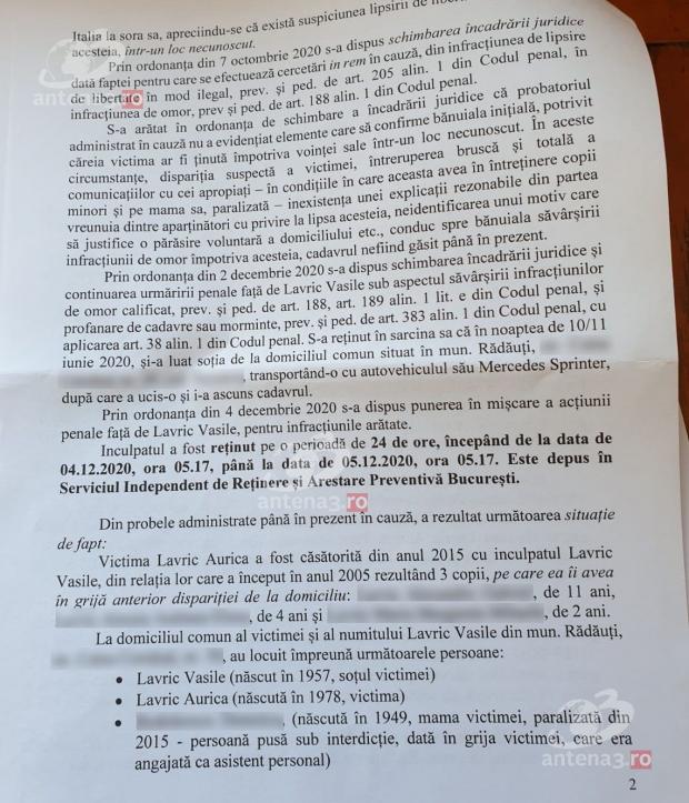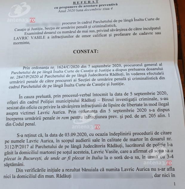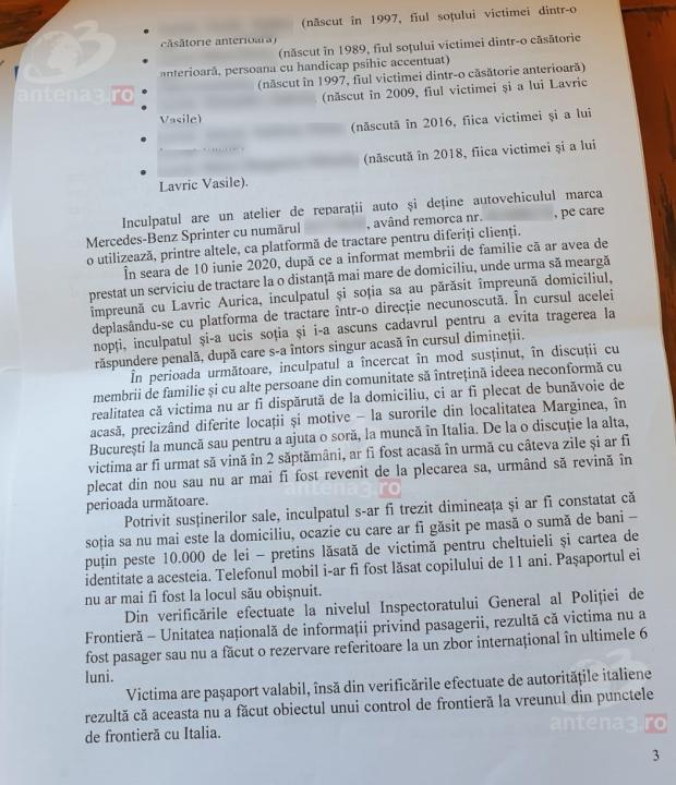 "În seara de 10 iunie 2020, după ce a informat membrii de familie că ar avea de prestat un serviciu de tractare la o distanţă mai mare de domiciliu, unde urma să meargă împreună cu Lavric Aurica, inculpatul şi soţia sa au părăsit împreună domiciliul, deplasându-se cu platforma de tractare într-o direcţie necunoscută. În cursul acelei nopţi, inculpatul şi-a ucis soţia şi i-a ascuns cadavrul pentru a evita tragerea la răspundere penală, după care s-a întors singur acasă în cursul dimineţii", se arată în referatul propunerii de arestare.