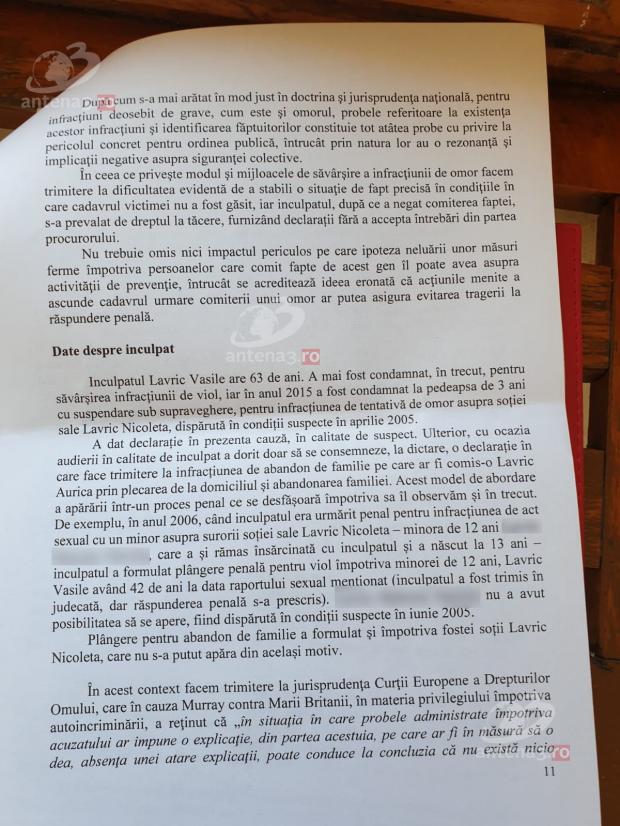 "În ceea ce priveşte modul şi mijloacele de săvârşire a infracţiunii de omor, facem trimitere la dificultatea evidentă de a stabili o situaţie de fapt precisă în condiţiile în care cadavrul victimei nu a fost găsit, iar inculpatul, după ce a negat comiterea faptei, s-a prevalat de dreptul la tăcere, furnizând declaraţii fără a accepta întrebări din partea procurorului", se mai arată în document.