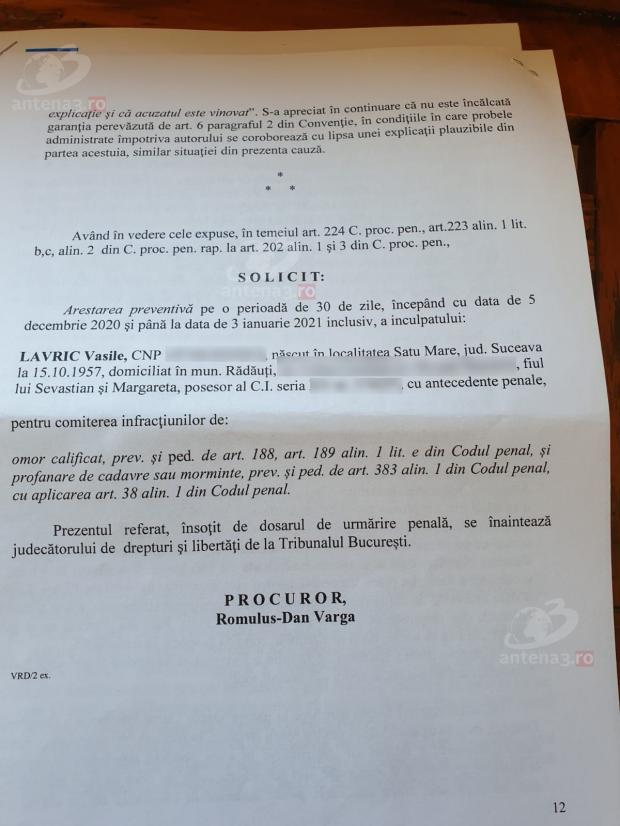 "Nu trebuie omis nici impactul periculos pe care ipoteza neluării unor măsuri ferme împotriva persoanelor care comit fapte de acest gen îl poate avea asupra activităţii de prevenţie, întrucât se acreditează ideea eronată că acţiunile menite a ascunde cadavrul umare comiterii unui omor asigură evitarea tragerii la răspundere penală", a mai notat procurorul de caz.