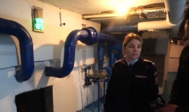 "A fost inundat", mărturisește locatara, iar reporterul constată că tubulatura care ar trebui să faciliteze aerisirea este ruptă. În plus, ușa metalic nu poate fi închisă.