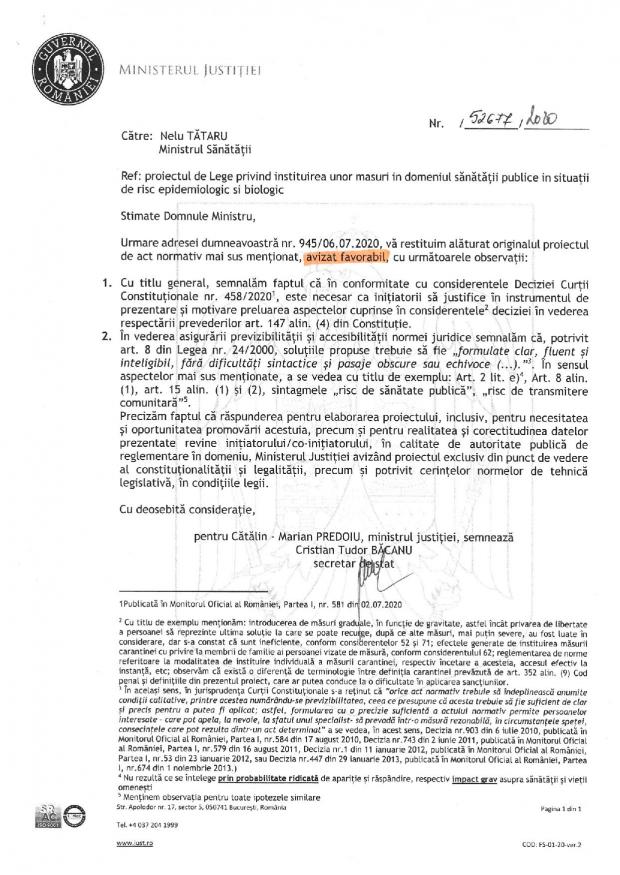Pentru o corectă informare a opiniei publice, precum şi pentru a demonta pretextele folosite de lideri ai PSD pentru a tergiversa adoptarea unei legi esenţiale şi urgente în combaterea răspândirii virusului, punem la dispoziţie avizul emis de Ministerul Justiţiei”, a transmis Executivul luni.