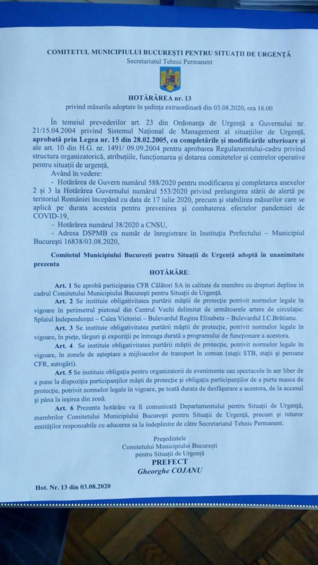 „S-a hotărât purtarea obligatorie a măştii de protecţie pe toată durata zilei în zona delimitată ca fiind Centrul Vechi, în toată zona pietonală. S-a decis obligativitatea purtării măştii de protecţie în pieţe, în târguri şi în expoziţii, pe toată durata desfăşurării expoziţiei, târgurilor de către toate persoanele. S-a hotărât purtarea obligatorie a măştii în staţiile STB, în gări, staţii CFR, peroane, autogări, staţii de auto, taximetre”, a declarat purtătorul de cuvânt al Instituţiei Prefectului - Municipiul Bucureşti, Mariana Stancu-Ţipişcă.