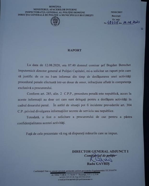În raportul publicat de GÂNDUL.RO, Gavriș îi explică șefului Poliția Capitalei Bogdan Berechet că detaliile solicitate de el sunt confidențiale, ”desecretizarea” fiind sancționată conform legilor în vigoare.