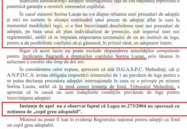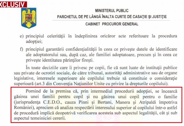 „Pornind de la premisă că, prin intermediul procedurii adopției, se încearcă găsirea unei familii pentru copil și nu găsirea unui copil pentru o familie (jurisprudența C.E.D.O., cauză Pinni și Bertani, Manera și Atrapladi împotriva României), apreciem că analiza respectării interesului superior al copilului într-o astfel de procedură implică deopotrivă verificarea acesteia sub aspectul legalității, cât și sub aspectul temeinic cererii”, se arată în document.