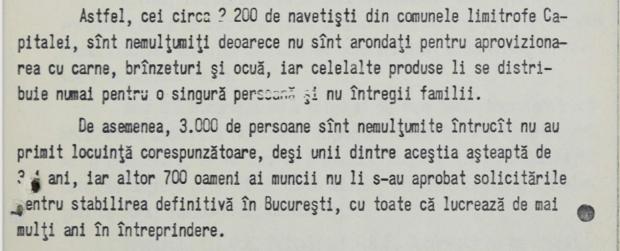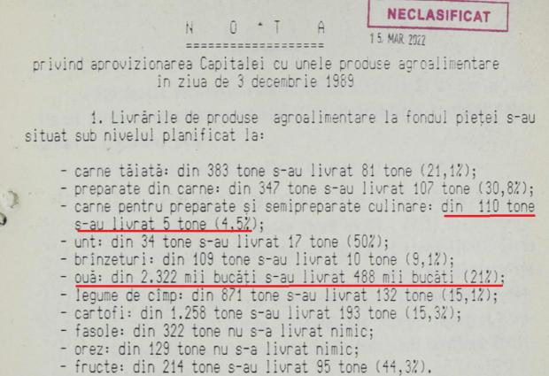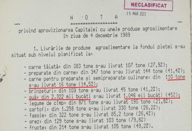 Pentru bucureșteni, se livraseră doar 4,5% din necesarul de carne, zero tone de orez și 15% din necesarul de cartofi sau legume. Fasole? Zero. Ouă? „488 mii bucăți”, dintr-un necesar de „2.322 mii bucăți”.