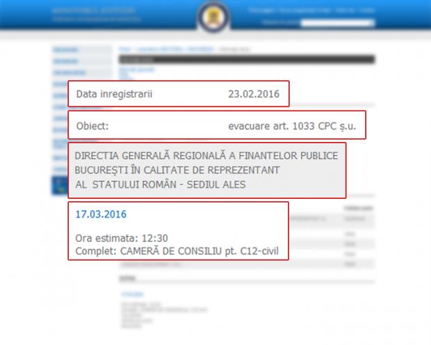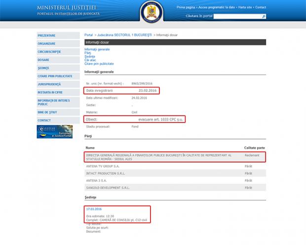 Potrivit portalului său, abia marți (23 februarie 2016) a fost înregistrată de către ANAF la tribunal o cerere de evacuare.