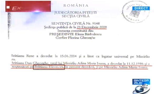 O hotărâre prezentată de instanţă în data de 23 decembrie 2009 arată că Eleonora Brătianu, moştenitoare a terenului familiei brătienilor, a murit.