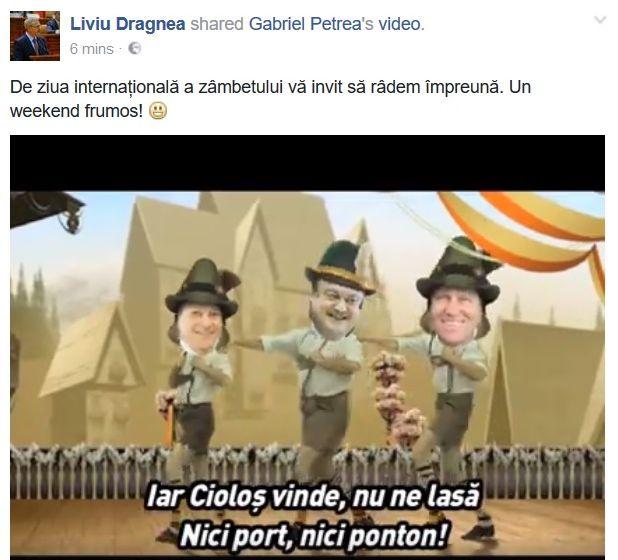 Alături de clip, Liviu Dragnea a scris: De ziua internațională a zâmbetului vă invit să râdem împreună. Un weekend frumos!