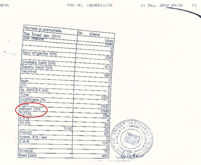 Astfel, pe www.antena3.ro a sosit un mail, de la fiica unei învăţătoare din Câmpulung Muscel, judeţul Argeş, al cărei salariu a fost redus cu 73% (!). Este vorba despre o învăţătoare care are o vechime de 37 de ani în învăţământ, datorită căreia sute de elevi au învăţat carte.