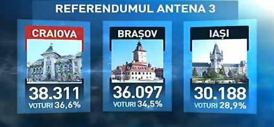 Astfel, oraşul Craiova a câştigat referendumul naţional lansat de Antena 3, cu 38.311 de voturi, reprezentând 36,6% din totalul de voturi, a anunţat Mihai Gâdea, în ediţia de marţi seară a emisiunii "Sinteza zilei".