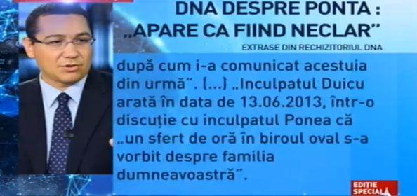 După mai multe indicaţii precise trasate de la Cotroceni chiar de Traian Băsescu, numele premierului Victor Ponta este menţionat în ancheta ce a dus la arestarea preşedintelui CJ Mehedinţi, Adrian Duicu. Deşi formulările procurorilor sunt vagi şi lipsite de orice consistenţă juridică, apariţia numelui premierului Ponta într-un dosar DNA este un precedent exploziv ce demonstrează intenţia ca principalul adversar al lui Traian Băsescu să fie scos din joc cu ajutorul procurorilor .