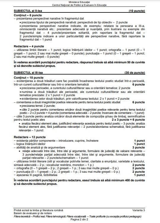 Subiectele date astăzi la proba scrisă la Limba și Literatura Română, pentru profilul umanist, pedagogic, cât și profilul real, au fost aceleași. Toate subiectele au fost obligatorii, acordându-se zece puncte din oficiu. Timpul de lucru efectiv fiind pentru toată lumea de trei ore. Proba scrisă la Limba și Literatura Română a fost împărțită în trei părți, fiecare cu cerințele de rezolvare. După ora prânzului va fi disponibil și baremul de corectare la proba scrisă pentru Limba și Litereatura Română.