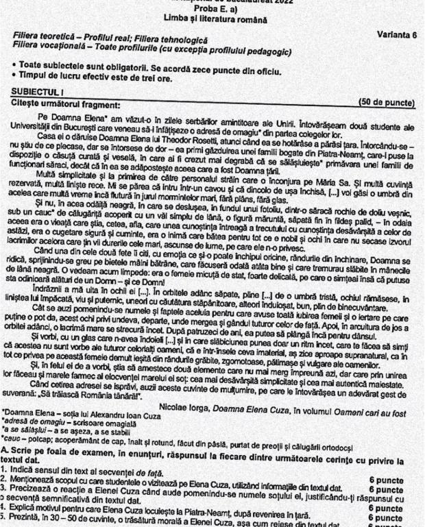 La uman și la real, subiectele la română la BAC 2022 au constat în textul la prima vedere din Nicolae Iorga "Doamna Elena Cuza", și perspectiva narativă a unui text din opera "Întunecare" a lui Cezar Petrescu.