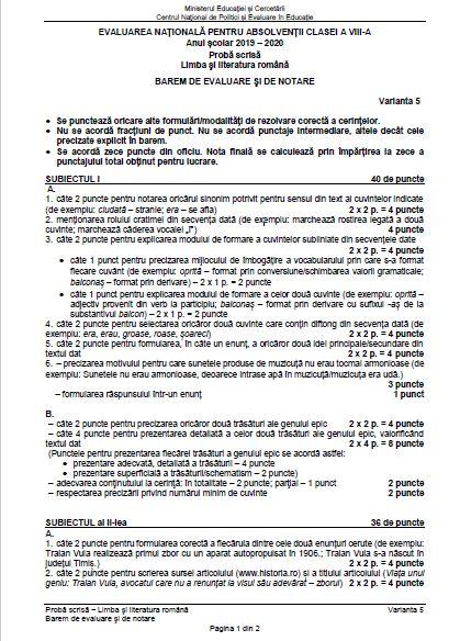 BAREMUL DE CORECTARE la Evaluarea Națională 2020, proba scrisă la limba și literatura română